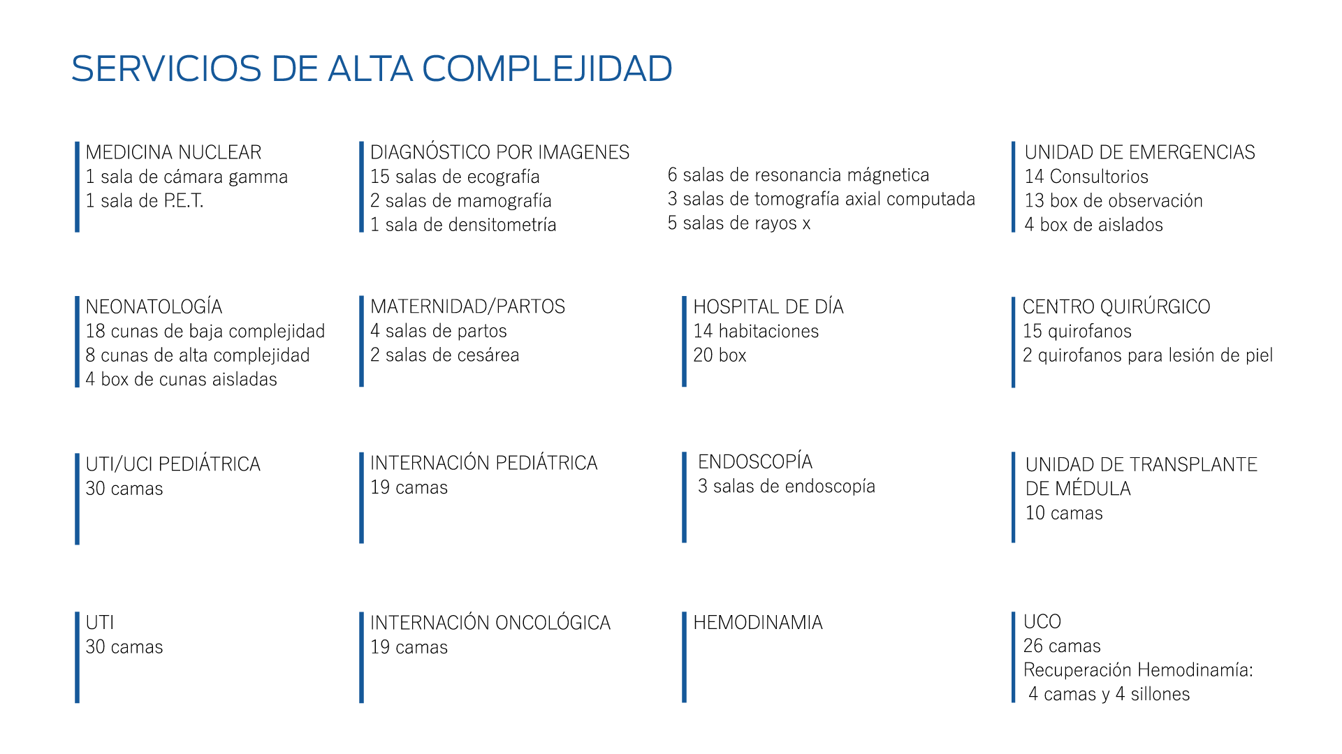 Las características y escala de este Campus nos hacen necesario ejecutarlo en etapas. La primera de ellas será el edificio de Hospitalización. Concluído el mismo contará con 45.000m2 cubiertos, 8 plantas, con hasta 400 camas, 17 quirófanos y estará focalizado en servicios y prácticas de alta complejidad: Unidad Coronaria con 25 camas; Unidad de Terapia Intensiva con 30 camas; Área de Trasplante de Médula e Internación Oncológica con 19 camas y un sector de aislados con 13 camas. Además se definió un Área destinada para la madre y el niño con 4 salas de parto, 2 quirófanos para cesáreas, Servicio de Neonatología con 30 cunas, Área de Internación Pediátrica con 19 camas y Unidad de Terapia Intensiva Pediátrica con 30 camas. Un Servicio de Diagnóstico por Imágenes con 6 resonadores, 3 tomógrafos, 15 salas de ecografía, 2 salas de mamografía, 5 salas de rayos x, entre otros. A esto se suman, 2 salas de hemodinamia, 3 salas de endoscopía, Servicio de Medicina Nuclear con PET y Cámara Gama, entre otras prestaciones.